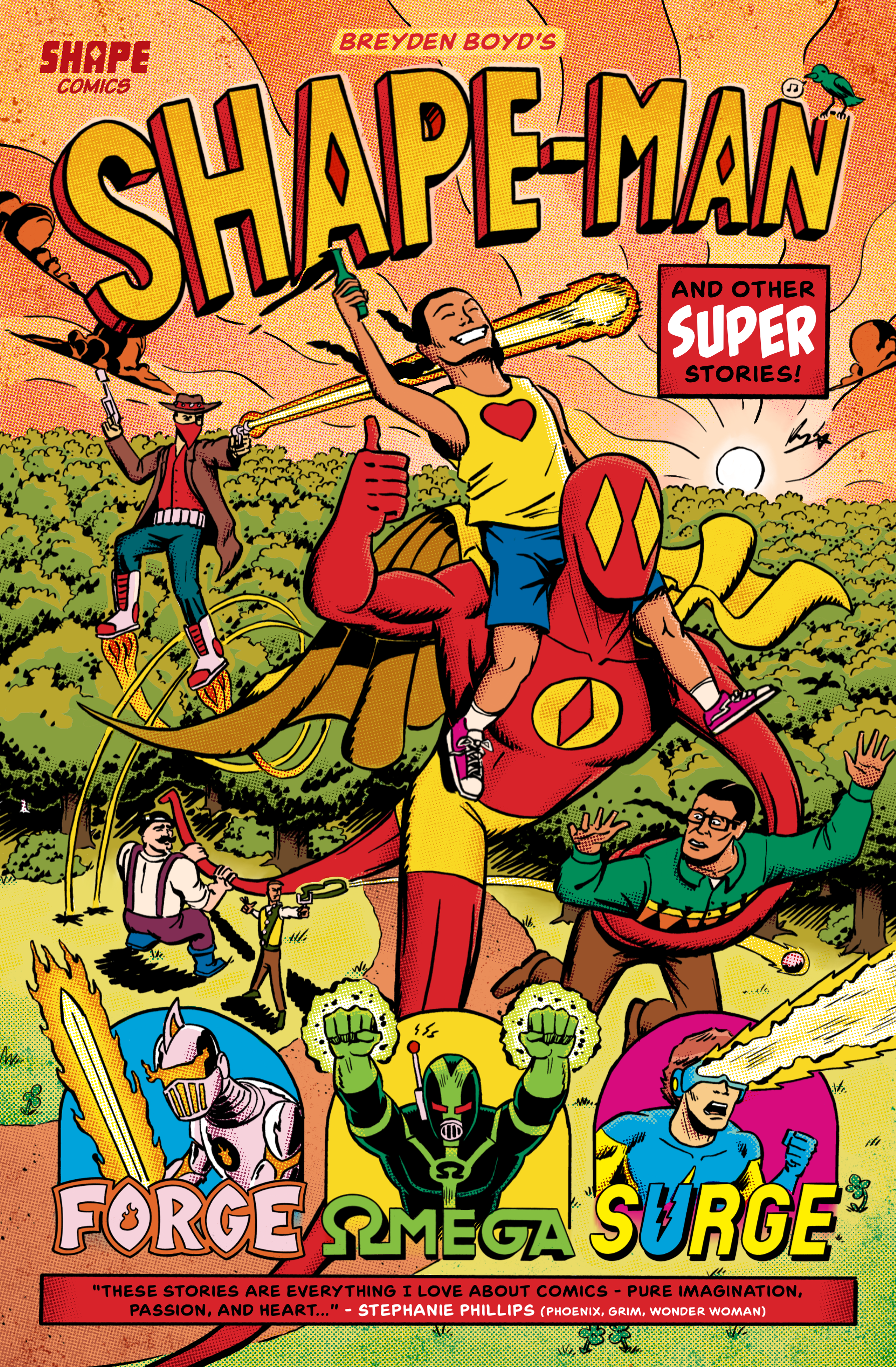 A 120+ page soft cover graphic novel, collecting Shape-Man #1-3, the Forge/Surge/Omega Triple Feature, an all-new Shape-Man VS Omega mini comic, and more bonus material!